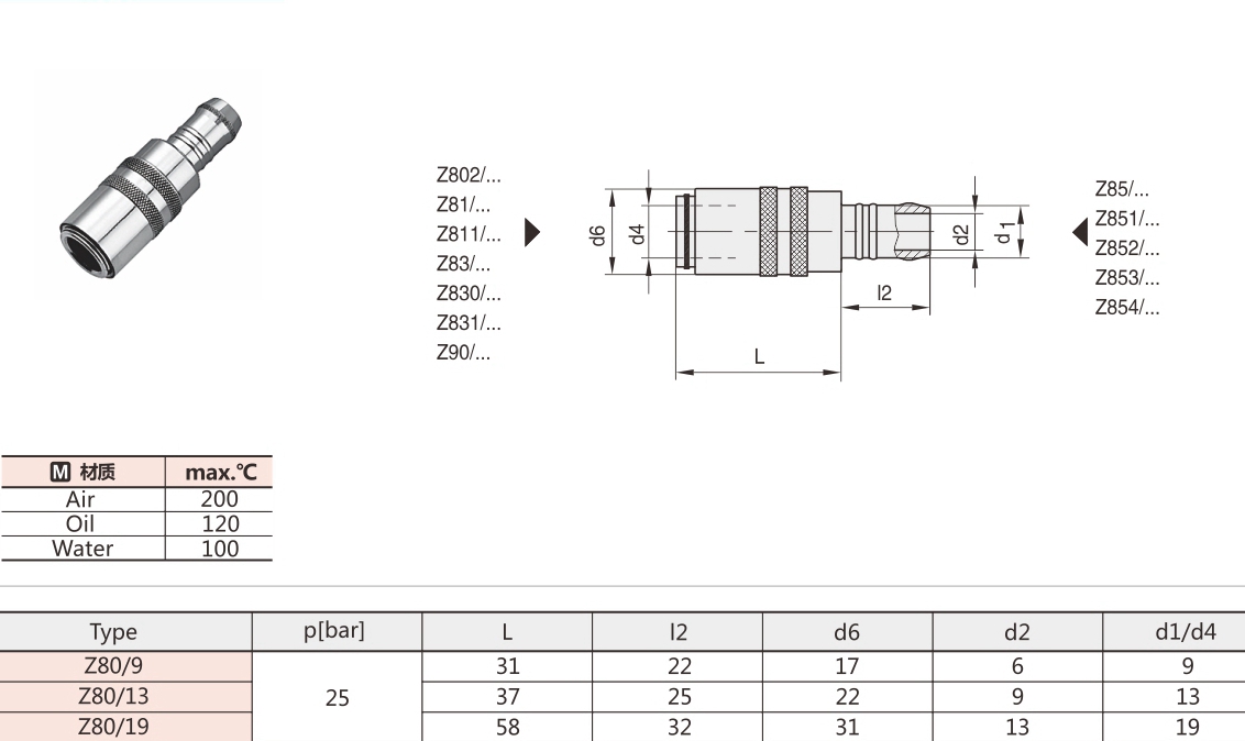 这款rapid coupling 根据外形分为直身型,45度角,90度角,对应的型号分别是Z80/…,Z80/…x45,Z80/…x90